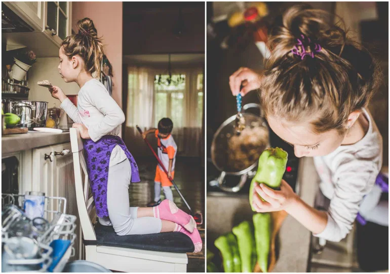 У дома, трябва да знаете, винаги всички са гладни. Прибирането на масата е напълно безсмислено упражнение, но тъй като кухнята и хола са в общо помещение, от страх да не влезе чужд човек или любопитството на съседите да не надделее иззад вдигнатите ни щори, винаги старателно докарвам един представителен външен вид. Заблудата на врага е очевидна за хора, които обичат да чистят и се разтоварват с тази драматична, за мен, загуба на време. И така, бидейки първичната жертва на гръмотевичната буря – лишена от разходка в планината и обяд в хижа, решавам да отмъстя на домочадието. О, детското свърши, хайде да сготвим, че след пет минути пак ще сте гладни, а който е закусил – да си почисти. Това второто започва едва след като Емо е изчистил ноктите си в устата на прахосмукачката. Малък момент, нали…